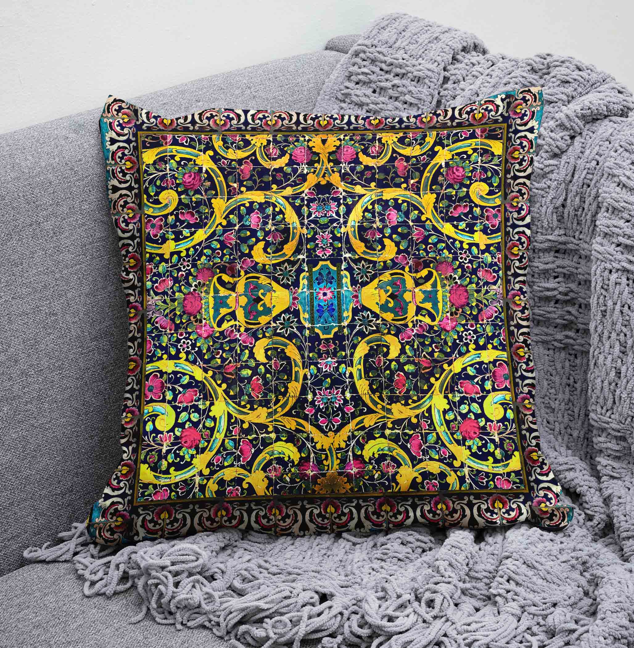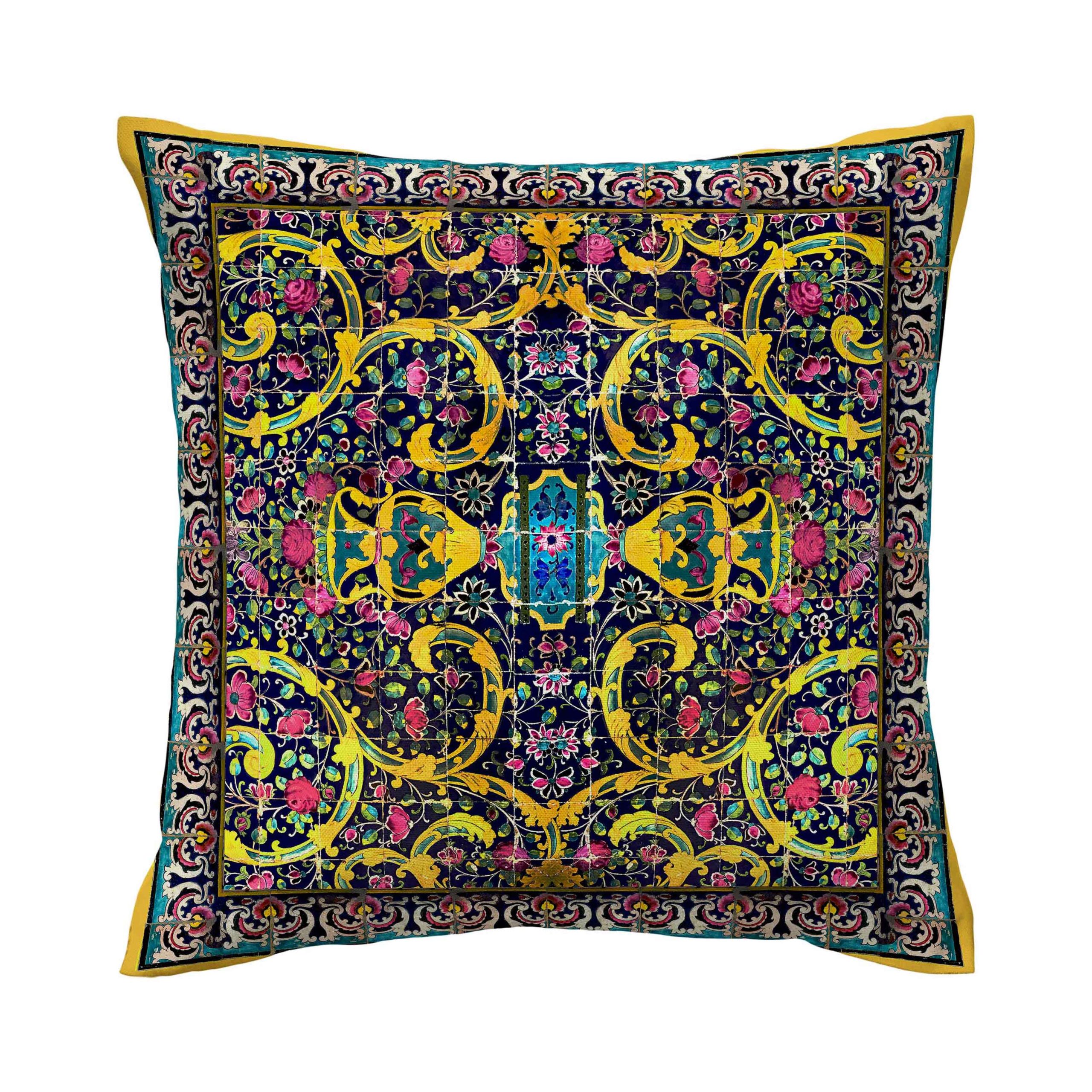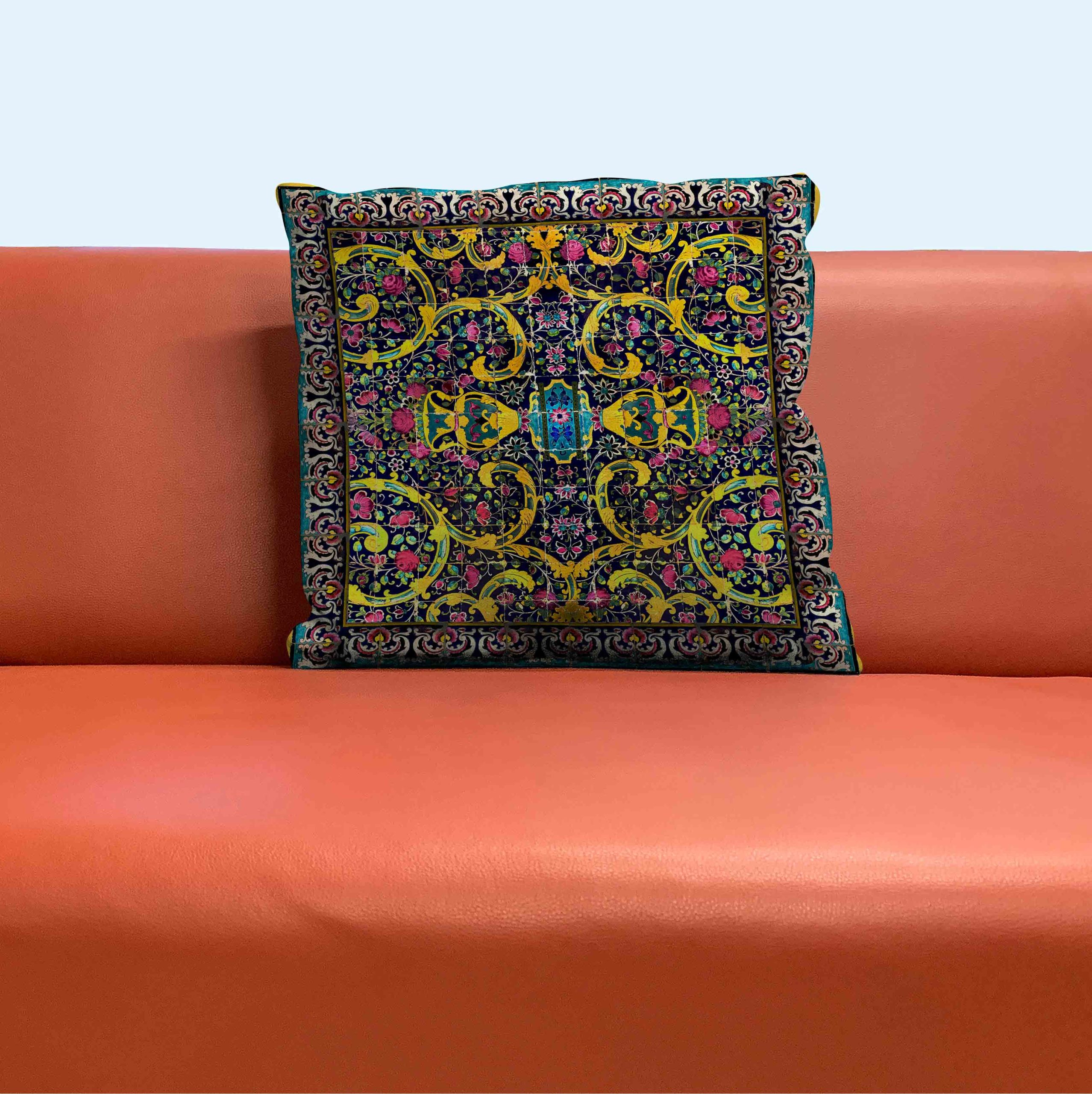 این کاور کوسن با طرح اسلیمی پیچیده و زمینه سرمهای، ترکیب بینظیری از هنر اصیل ایرانی و رنگهای شاد را به فضای منزل میآورد. نقشهای طلایی و گلهای صورتی و سبز، به همراه جزئیات دقیق و تقارن چشمنواز، جلوهای لوکس و هنری ایجاد میکند. کیفیت بالای چاپ باعث شده رنگها درخشان و ثابت باقی بمانند. وجود زیپ مخفی کارکردی آسان و ظاهری مرتب را تضمین مینماید.