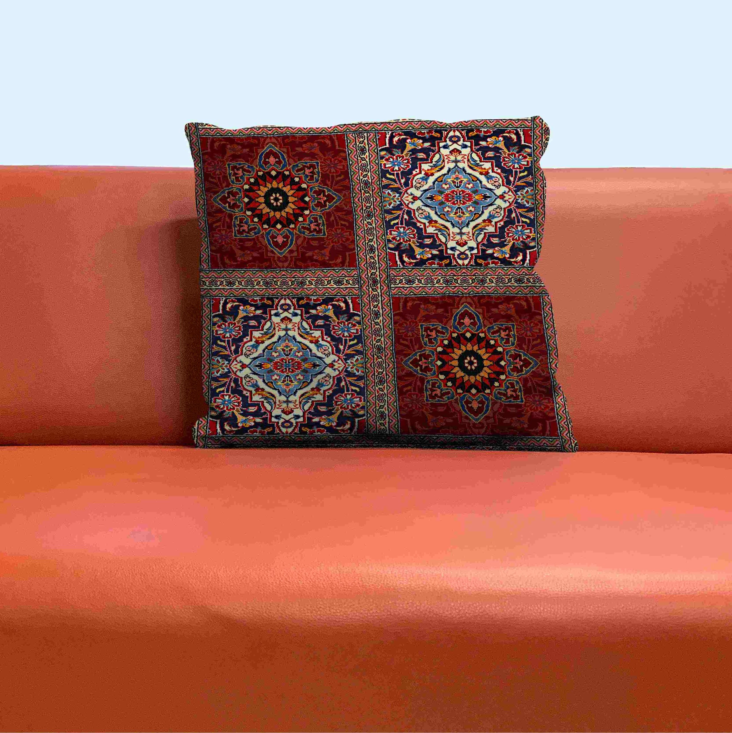 این کاور کوسن با طراحی الهامگرفته از فرشهای سنتی ایرانی، آمیزهای از هنر اصیل و شکوه رنگ را به فضای خانه میآورد. زمینه قرمز آجری پررنگ، در کنار نقوش ترنج مرکزی با رنگهای آبی، کرم، نارنجی و سبز، جلوهای کلاسیک و چشمنواز ایجاد میکند. جزئیات دقیق در خطوط و گلها، کیفیت چاپ بالای محصول را نشان میدهد. زیپ مخفی آن علاوه بر سهولت استفاده، به یکپارچگی و زیبایی کلی طرح کمک میکند.