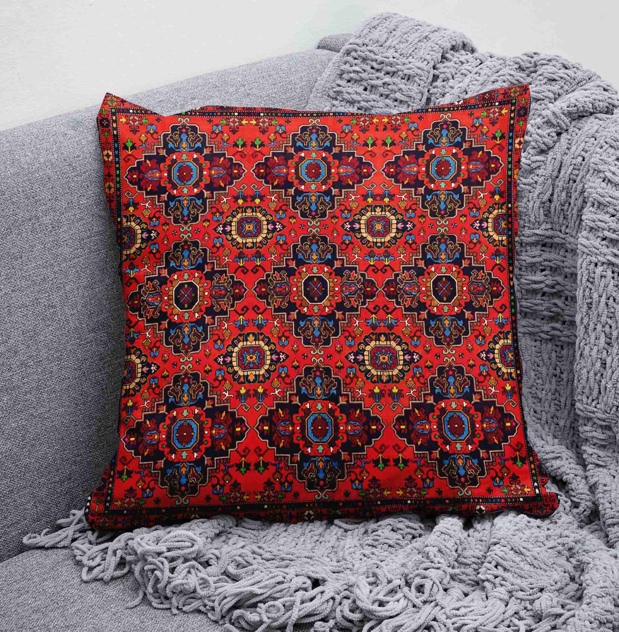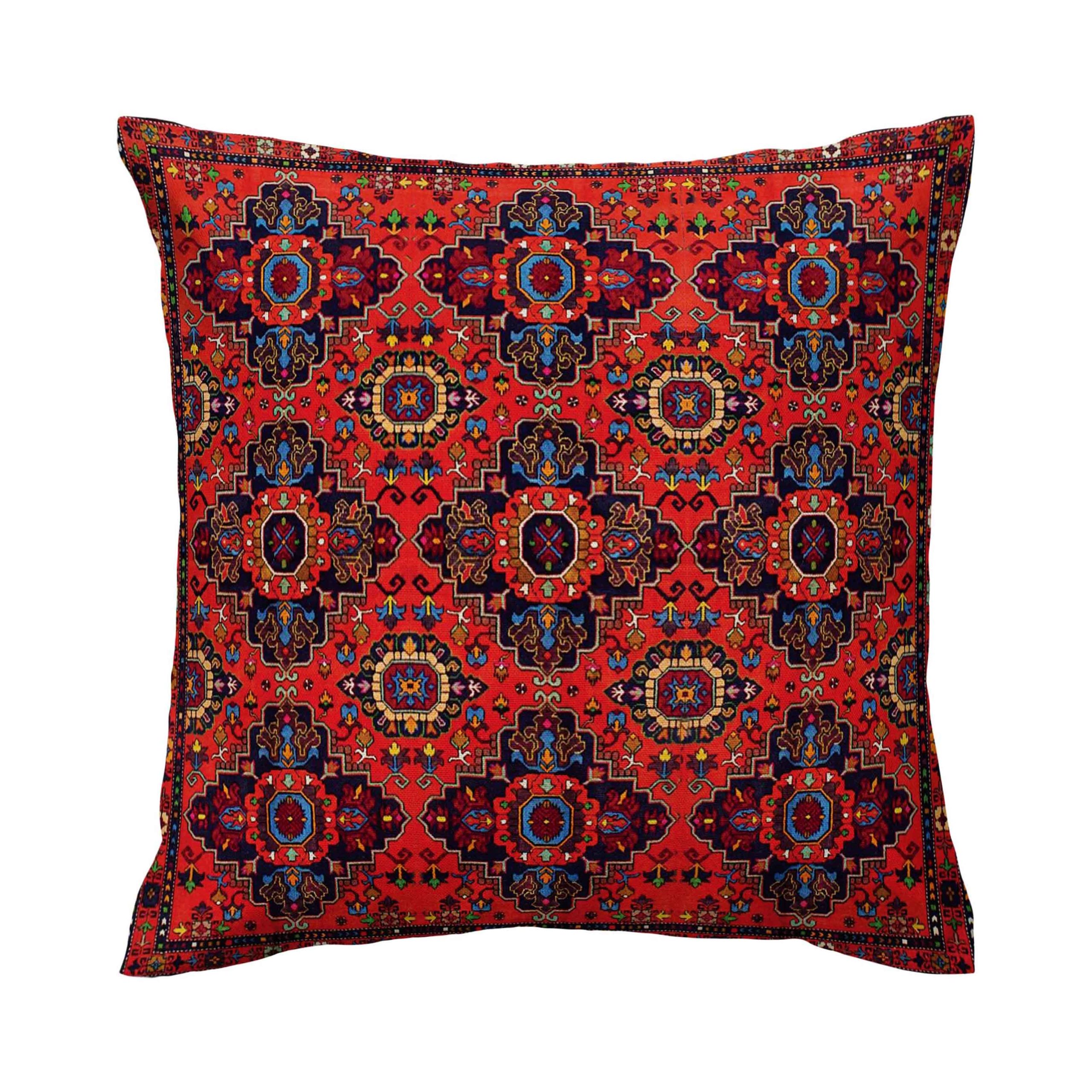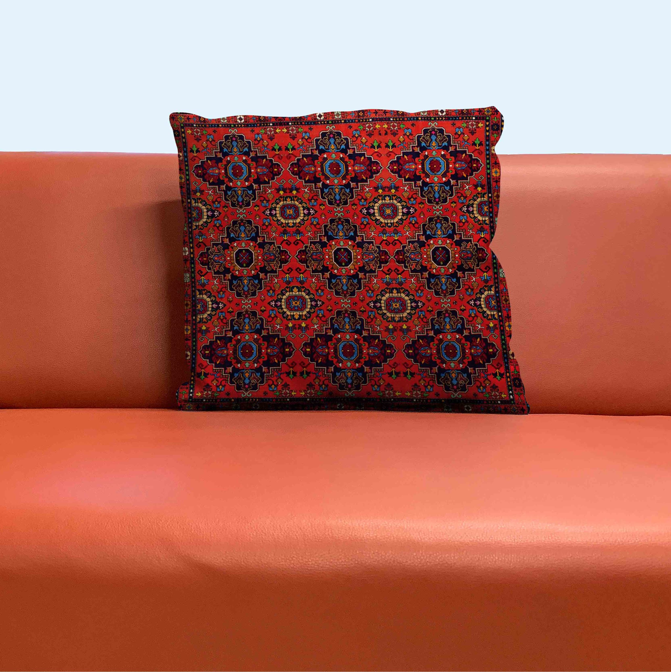 کاور کوسن طرح فرش سنتی زمینه قرمز نقوش هندسی