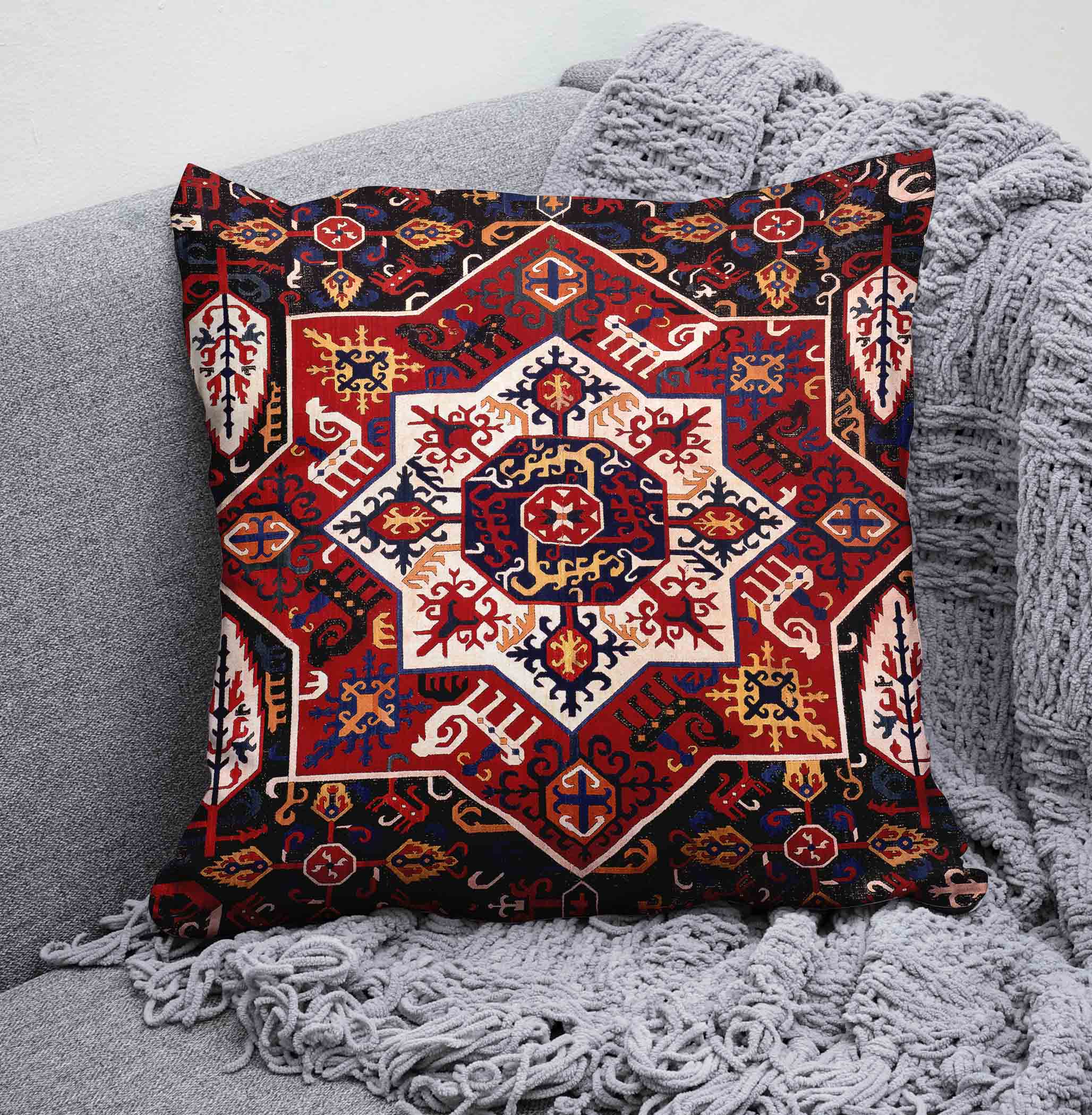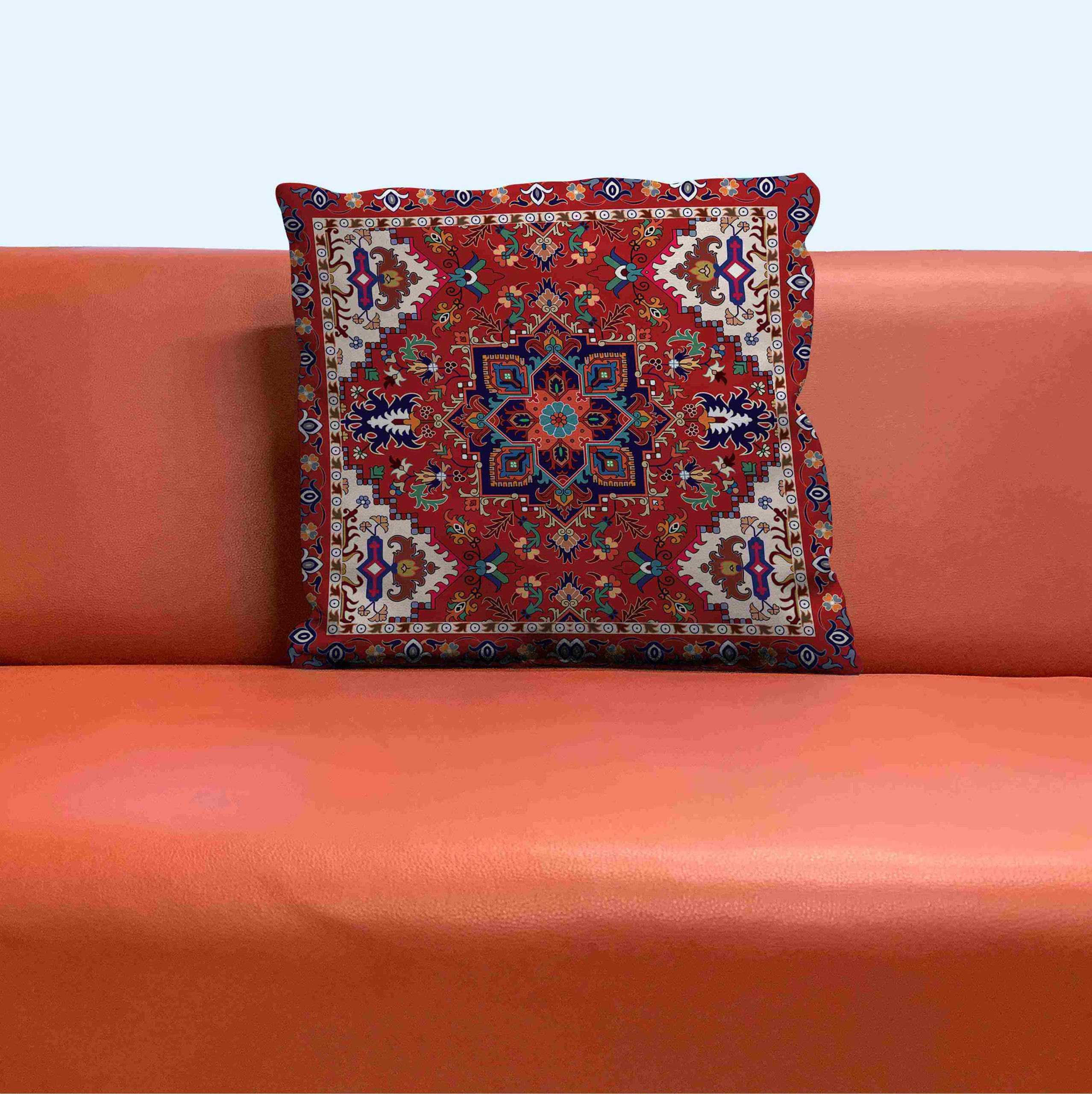 این کاور کوسن با طراحی باشکوه گلیم قفقازی، جلوهای چشمگیر و اصیل به دکوراسیون شما میبخشد. زمینه قرمز پررنگ با نقوش آبی، سبز و کرم، حس گرما و صمیمیت را به فضا اضافه میکند. طرح مرکزی ستارهای همراه با حاشیههای پرجزئیات، یادآور هنر دست بافندگان سنتی منطقه قفقاز است. کیفیت چاپ بالا و رنگهای مقاوم در برابر شستوشو، زیبایی محصول را برای مدت طولانی حفظ مینماید. زیپ مخفی آن نصب و جداسازی را آسان کرده و به حفظ هماهنگی ظاهری کمک میکند.